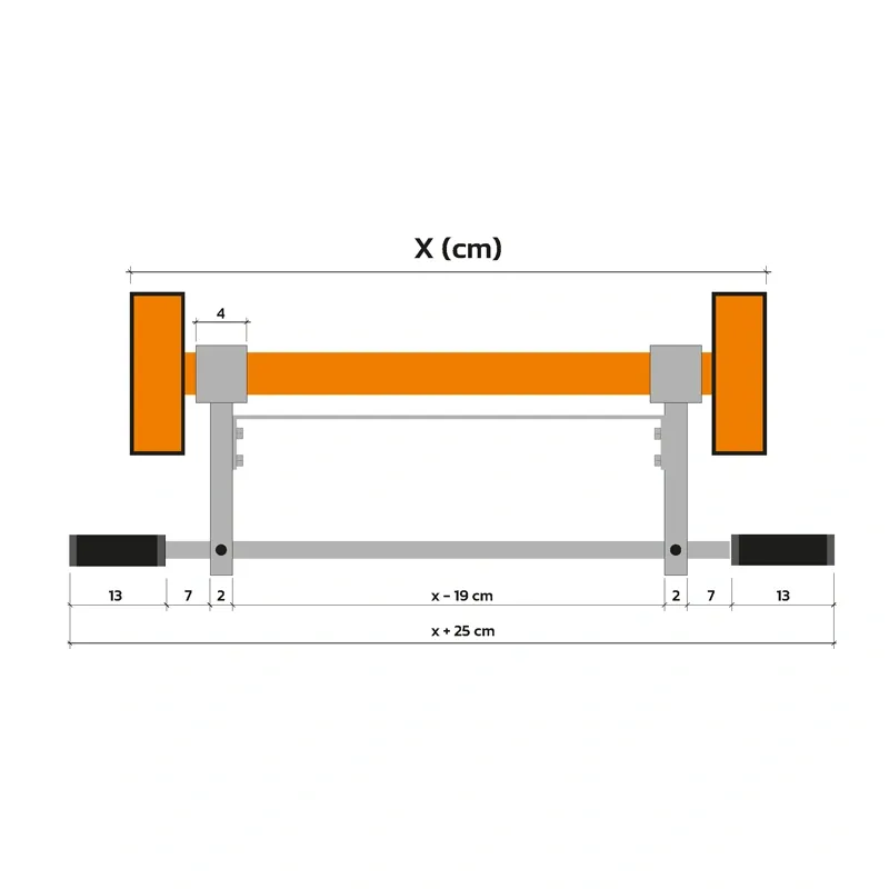- Rozpěra ramen hrazdy je nastavitelná, což umožňuje snadno přizpůsobit šíři hrazdy šířce žebřin.