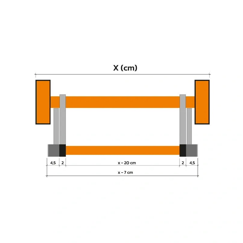 - pro správné zavěšení hrazdy na žebřiny (skrze bezpečné zatížení šprušlí) je důležité vybrat příslušnou šíři hrazdy. Šíře hrazdy (nikoli délka tyče hrazdy) je vždy uvedena pro vnější rozměr žebřin.